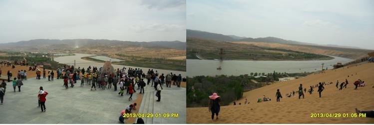 沿著黃河?xùn)|岸,由南向北,走在河岸邊的木質(zhì)人行棧道上,微風(fēng)輕拂,游客熙熙攘攘。棧道下面,不時(shí)發(fā)出一陣陣黃河浪拍打岸邊卵石的聲音,棧道西側(cè)是廣際的黃河河面,沙坡頭特有的羊皮筏子載著游客,順著主河道東側(cè)漂流而過(guò),偶爾漂入浪谷,游客不時(shí)發(fā)出一些驚嚇聲;主河道及西側(cè),間或有旅游快艇飛馳而過(guò),拉起一道道浪花。棧道東側(cè)是旅游觀光車(chē)的通道,乘坐觀光車(chē)每人次費(fèi)用20元,觀光車(chē)駕駛員兼講解員,沿途不停的向游客解說(shuō)景點(diǎn)。路邊涼皮、涼面小攤,食物價(jià)格不菲,一份6元的涼皮、涼面賣(mài)到10元,一只4元的鹵雞腿售價(jià)7元,普通瓶裝健力寶等飲料賣(mài)到5元,比市區(qū)價(jià)格多出2元。